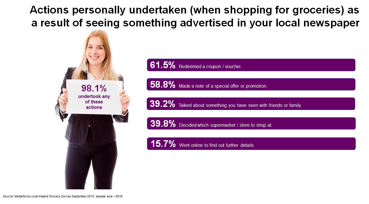 A quite extraordinary 98% of consumers undertook a further action as a result of seeing something advertised in their local newspaper. These actions included coupon redemption, making note of a special offer, discussing the advertisement with friends or family, deciding which supermarket to shop at, and going online to get further information.