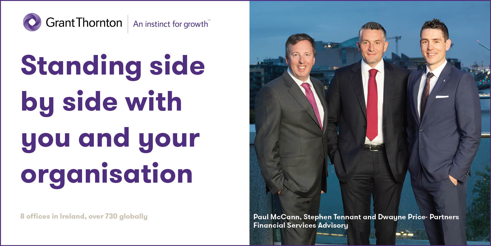 In this year’s campaign, each ad depicts senior partners immersed in scenes from their respective industries with a tagline that provides the essence of their division. For example, Paul McCann, Stephen Tennant, and Dwayne Price feature on a backdrop of the IFSC with the tagline “Standing side by side with your organisation”. They are partners with the Financial Services Advisory Division which works with many of the largest global corporates domiciled in Ireland.