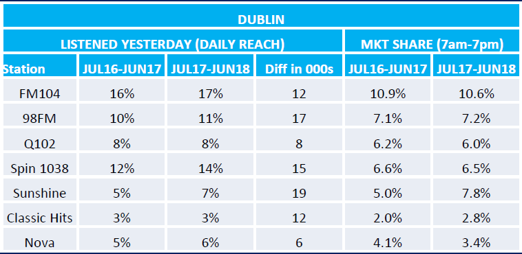 At an individual programme level it’s been a steady book without many significant fluctuations in listenership. FM104 and 98FM prime time schedules have all held steady or increased modestly. Q102 breakfast is down10,000 but this is attributable to a decrease in show length (now 6-9am instead of 6-10am) – as a result their mid-morning show is up 7,000.