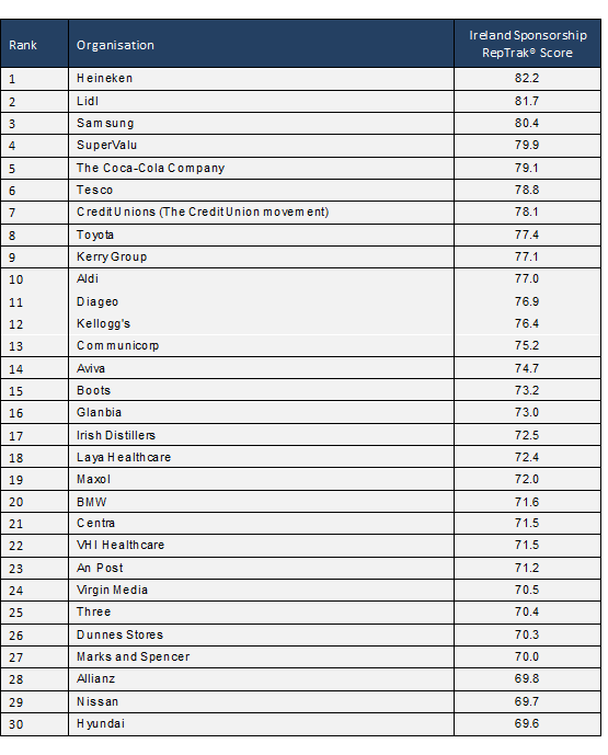 Heineken has topped the rankings in the inaugural Ireland Sponsorship Reptrak 2018 survey which was published today by The Reputations Agency.