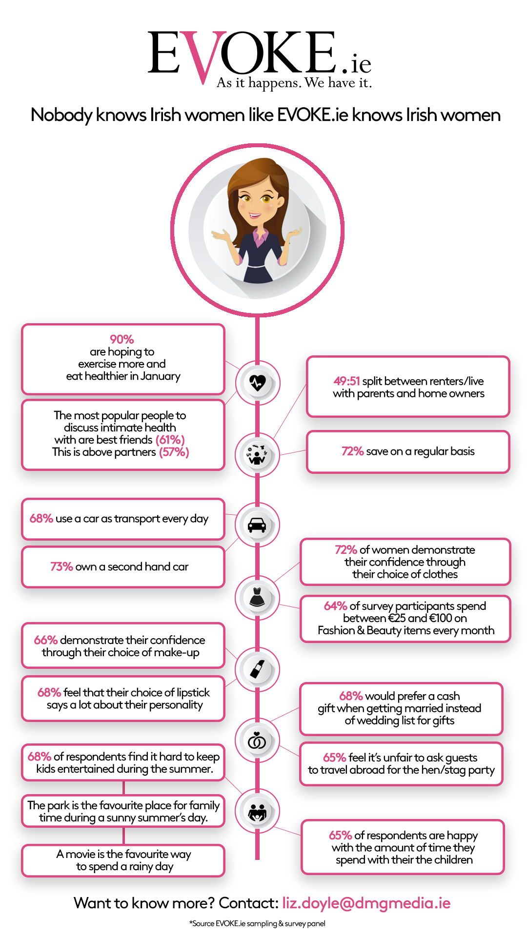 A new survey of 3,200 Irish women, carried out by Evoke.ie, sheds some light on their daily lives, their habits and beliefs and how they feel about family, finances, beauty, style, motoring and weddings.
