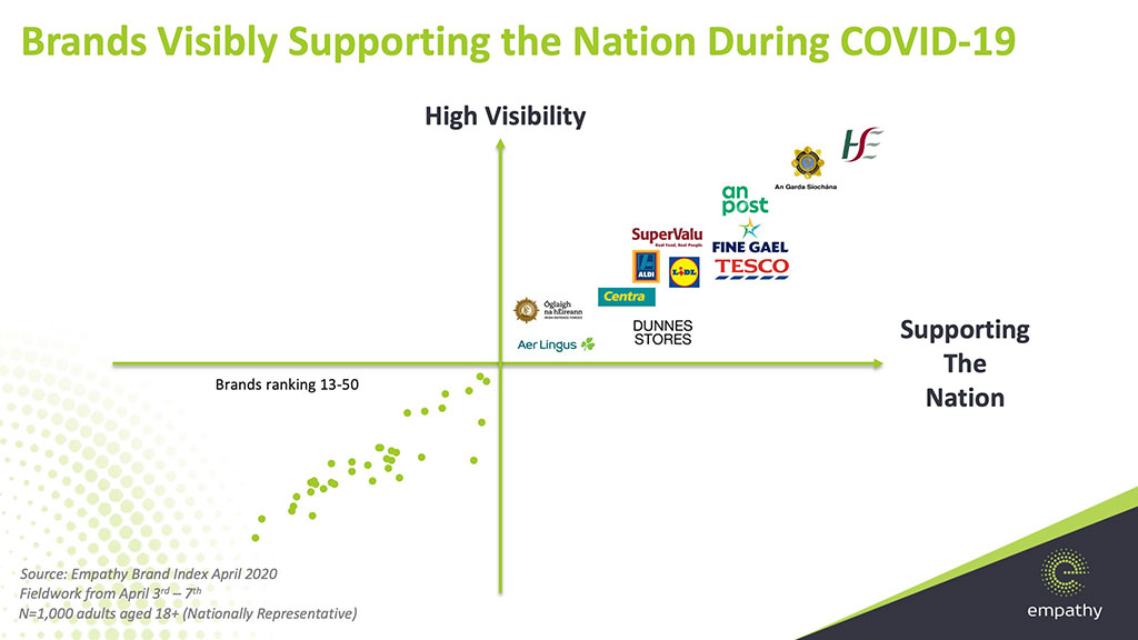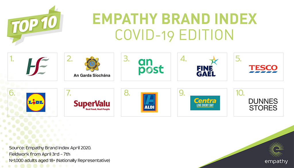 An Garda Siochana and An Post are in second and third place respectively in the Empathy Brand Index, with their visibility and the level of support they are delivering, to the fore. An Garda Síochána perform marginally better in relation to their visibility during the crisis to date, which we would expect to see increase over the coming weekend. Their visibility is complimented with strong endorsement for their performance at a National level, where they are slightly more likely to be endorsed than for their impact on people at a personal level.