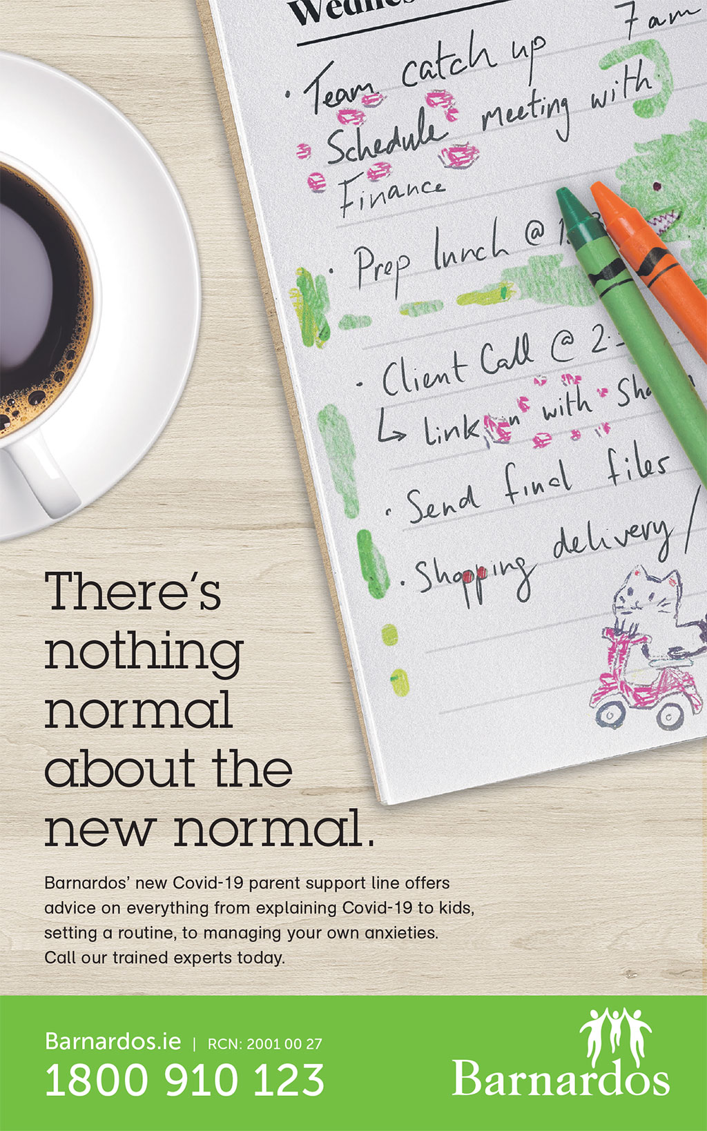Barnardos Director of Fundraising Mary Gamble said: ” Parents are finding their worlds of parenting and work colliding right now, so we set out to find a simple way to make the point, and give them a sense that they’re not alone.” Sarah Walsh, Senior Strategist, The Public House, added: “This was a really unique challenge for both ourselves and the team at Barnardos, offering a new service to all parents for the first time. What’s really interesting is that regardless of who they are, where they live or what age their kids are, all parents are feeling the strain of the covid19 restrictions right now. Getting that across in the creative was really important for us.”