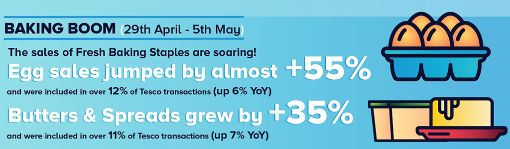 This baking boom is also evident in Tesco stores with Clear Channel/Dunnhumby analysis of its sales figures showing eggs and butter/spread jumping by 55% and 35% respectively. The good weather has sprung an uplift in sales of ice cream by a whopping 74% across the two-week period to April 19th.