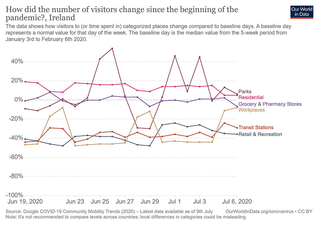 Apple’s routing requests mobility data to Monday 6th July shows driving in Ireland is 15% above January’s baseline and up 34% in the past fortnight. Figures indicate public transport is now above 50% of pre-COVID-19 levels. Driving in Northern Ireland is now 19% above baseline, while the UK has reached parity.