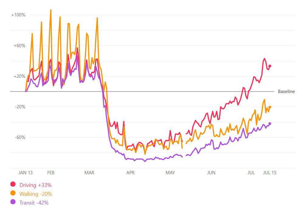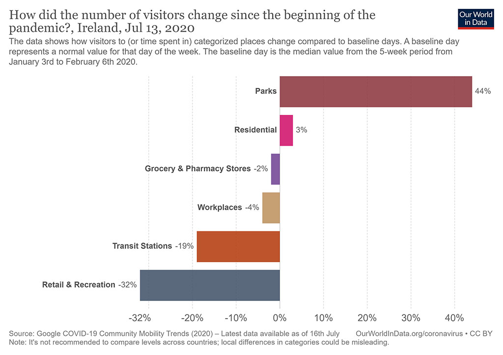 Google’s latest COVID-19 Community Mobility Report across environments as of Monday 13th July illustrates the continued trend towards workplaces from home. Relaxed restrictions and longer days sees leisure and recreation time increasingly spent outdoors, as can be seen by the uplift in parks presence. Elsewhere the deficit in transit stations has decreased from 39% to 19% in the past fortnight.