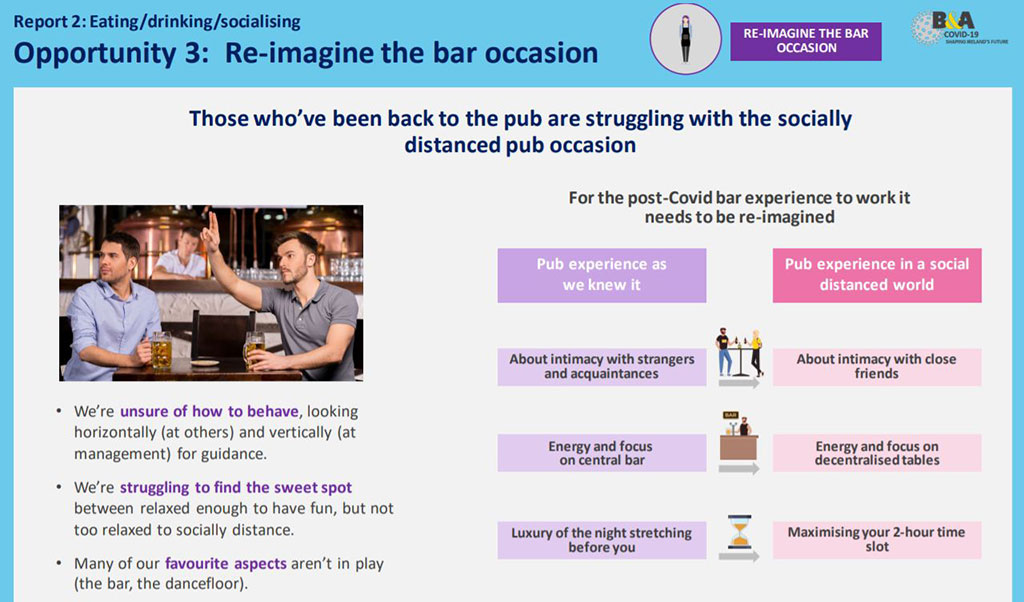 Those most likely to visit a pub in the next four weeks are male (38% v 22%), under 34 (32%) and urban (35%). B&A report that 30% of all adults will visit a pub in the next four weeks. For those that do, B&A highlight a re-imagination of the bar occasion, where the traditional focus of the bar and the dancefloor are replaced with an emphasis on decentralised tables. It begs the question as to whether the impulse ‘at-bar’ decision has temporarily been replaced by a more considered and planned choice, made much earlier?