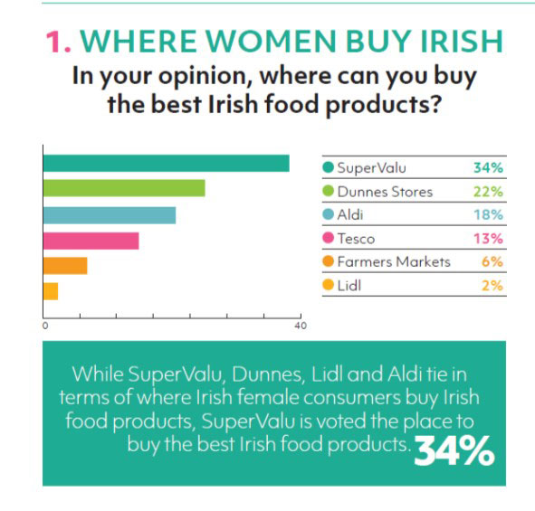 Women who responded to the survey stated they find SuperValu is the best place to buy Irish food products. 34% mentioned Supervalu, while Dunnes Stores followed at 22% and Aldi at 18%.