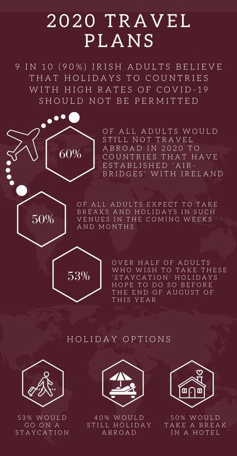 A nationwide poll by of 1,000 by iReach Insights has found that following the re-opening of hotels in Ireland, 50% of all adults expect to take breaks and holidays in such venues in the coming weeks and months. This number is slightly higher amongst the younger generation with 59% of those aged between 18-24 and 52% of those aged between 25-34 hoping to make a stay in Ireland, in such venues, the coming weeks or months. Over half of adults (53%) who wish to take these ‘staycation’ holidays hope to do so before the end of August of this year. Those aged between 25-43 are most determined to take a staycation before the end of August, with 77% of this age group stating so. More on the study features in the infographic below.