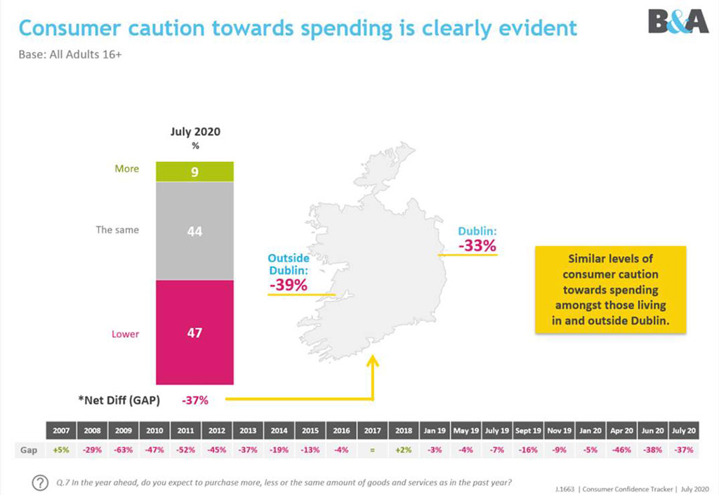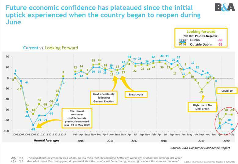This latest wave of the B&A Consumer Confidence Barometer was conducted from 16th – 29th July 2020 and shows that overall consumer confidence shows little movement on the initial uptick experienced when the country began to reopen during June and now stands at –69% (-68% during June).