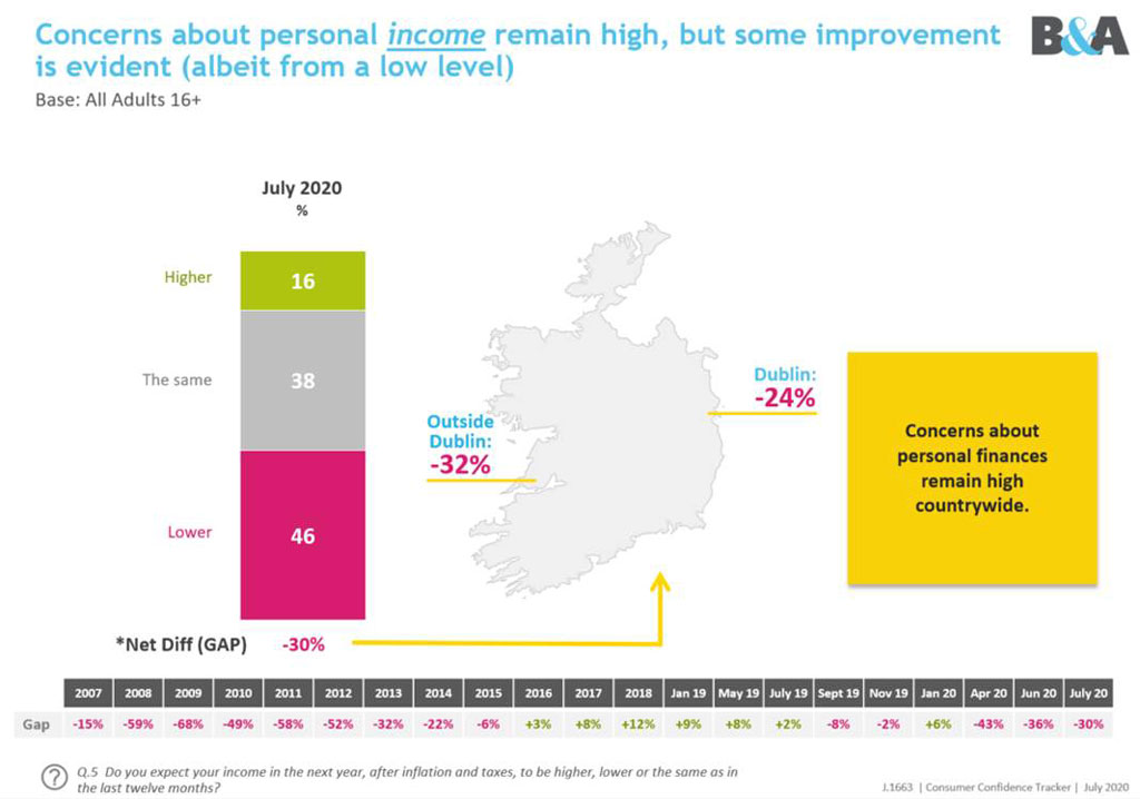 Amid a backdrop of businesses reopening the latest wave of consumer confidence tracking suggests personal income concern has plateaued as the general tone is now less negative at -30. With concerns being less pronounced in Dublin.