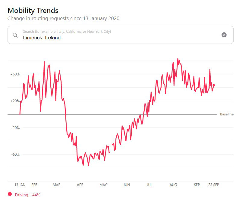 Apple’s routing requests mobility data on Wednesday 23rd September August shows driving in the county is +44% above January’s baseline.