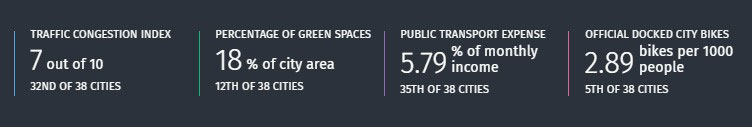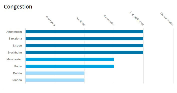 In terms of traffic congestion, Dublin ranks a lowly 33rd of 28 cities in terms of time delay at 52 mins per 100km, and 35th for percentage of roads congested at peak times (18.5%).