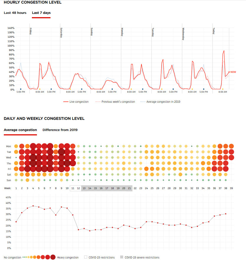 Traffic in Limerick has recovered best of Irish cities and is now on a par with last year’s levels. The TomTom Traffic Index provides detailed insights on live and historic road congestion levels in cities around the world. Last week’s congestion level in Limerick at 30% is the highest recorded since the outbreak of the pandemic and up from 22% four weeks previous. Figures so far this week show a rise of 2% and moving above last year’s level. Rush hour also very much back as illustrated below.