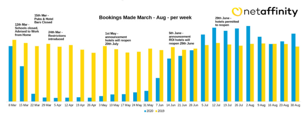 This graph highlights the impact on the volume of bookings made for all Net Affinity clients from March 1st to August 31st. It shows the volume of bookings missed during the lock down period compared with 2019.