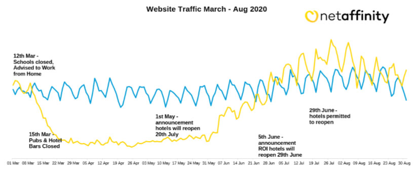 The graph above shows the level of traffic to Net Affinity clients during the same time period and it indicates the same impact on hotel website visitors.