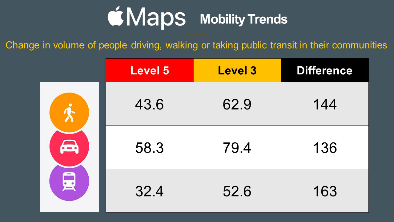 Apple’s Mobility Trends Reports derived from anonymized Apple Maps data requests demonstrate how people are changing their travel habits through reporting change in routing requests since 13 January 2020. Here are the average national daily index figures from national Level 3 in October and so far in Level 5 and the differences between the two.