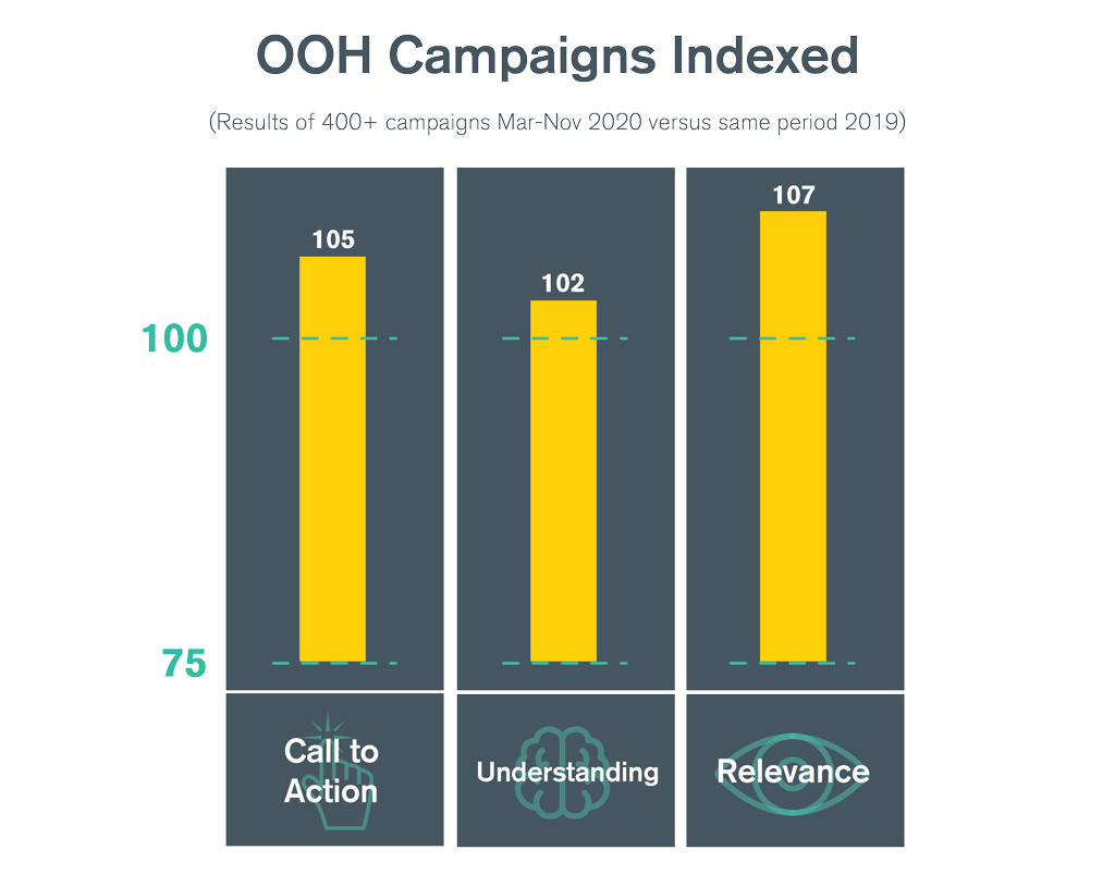 This week we are sharing analysis of aggregated research results of more than 400 OOH campaigns that have been active during some form of restriction associated with the pandemic since March 2020. Across all key metrics, including recall, relevance, understanding and call to action, campaigns have performed better in 2020 than in the same period 2019. All campaigns were researched as part of our Poster Impact programme, which includes more than 1,000 campaigns each year.