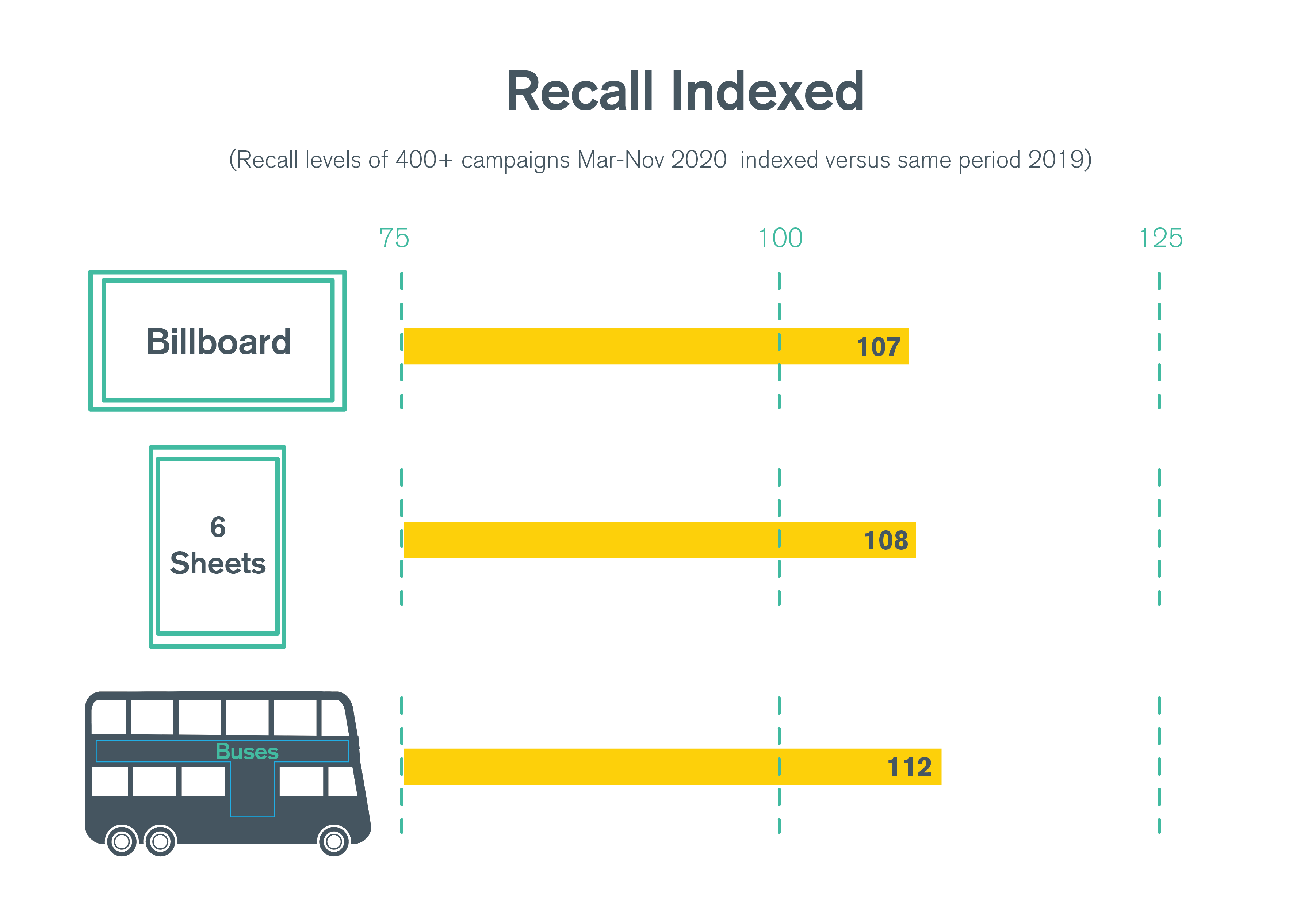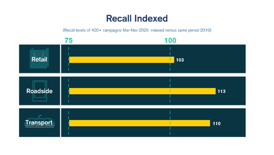 Recall levels across all main formats such as billboards, buses and 6 Sheets has increased on 2019. Average recall for these formats is indexing between 107 and 112 versus last year. Similarly, when looking at environments it is the same story – improved recall across retail, roadside and transport environments. All in all, average recall is indexing at 106 across all formats and environments, versus a base of 100 for the same period 2019.