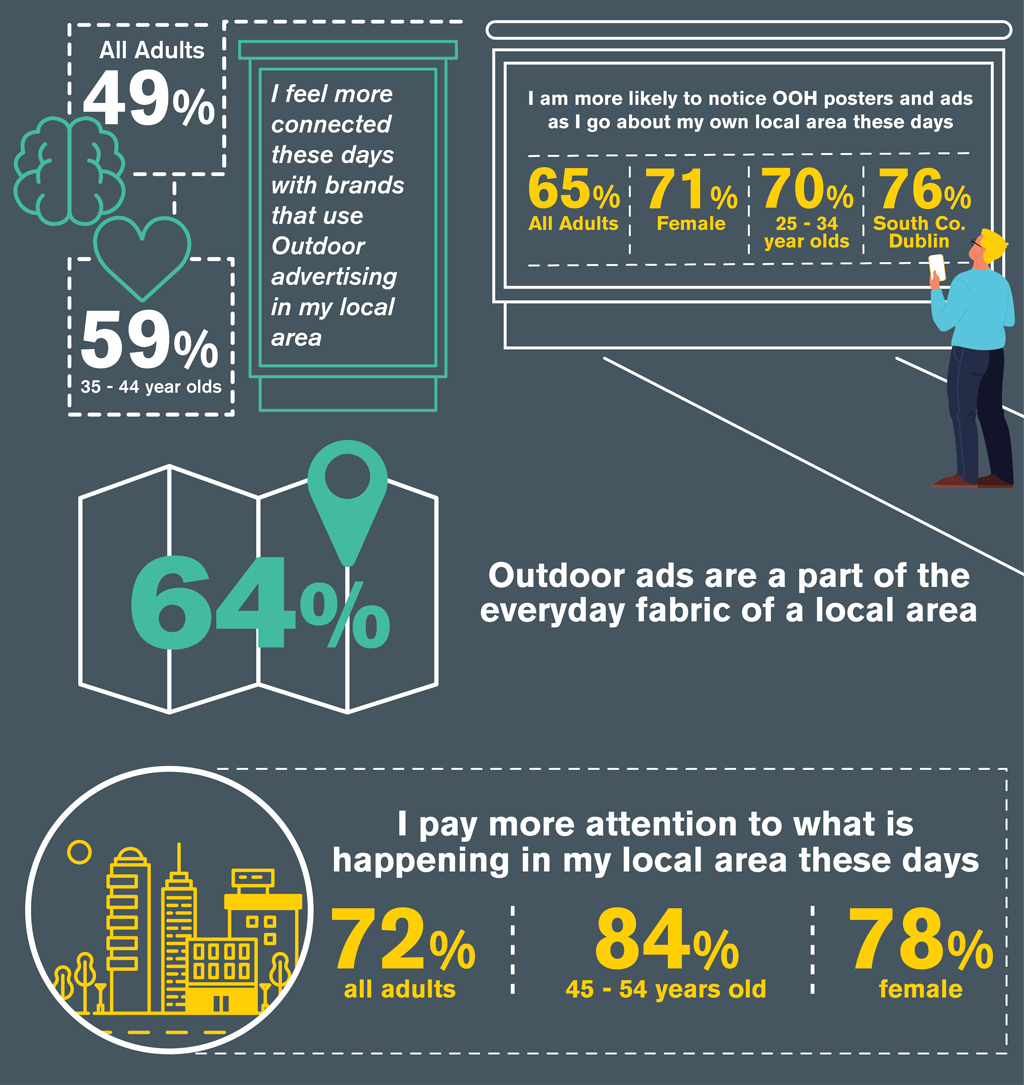 72% of adults agree that they pay more attention to what is happening in their local area these days, rising to 84% among 45-54 year olds. People are tuned in and attentive to their surroundings now, perhaps more so than any point in recent years. For instance, 71% of females and 76% of those living in South County Dublin say they are more likely to notice OOH posters and screens as they go about their local area these days. More than 6 in 10 (64%) believe Outdoor ads are a part of the everyday fabric of a local area.