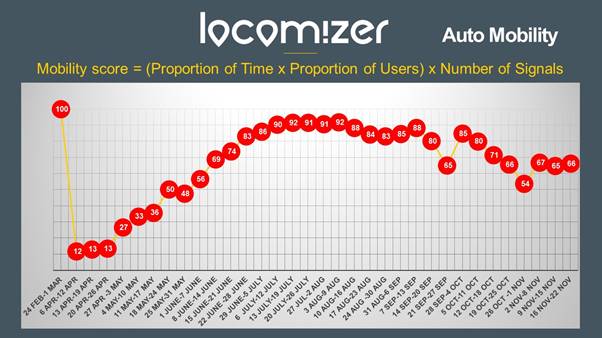 Locomizer mobility data is based on analysis of mobile phone location data via anonymised app reporting. Latest figures (w/e 22th November) show that the auto mobility level in ROI, which is calculated though a combination of mobile users, time, and signals, is at 66% of where it was pre-COVID-19 recorded at the end of February.