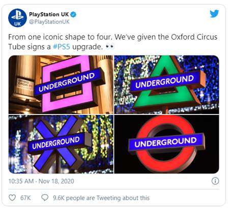 For the hotly anticipated launch of the PS5 in the UK, Sony staged a colourful takeover of Oxford Circus tube station in London. The marketing stunt saw the Tube station rebranded with the PlayStation’s iconic shapes, augmenting the Underground’s signature roundels. Station interiors were rebranded too, with the Bakerloo, Victoria and Central line platforms decorated with walls and signage reflecting the playful campaign. Several stations were also renamed after high profile titles set to launch on the PS5, while a global light installation took over the Piccadilly Lights.