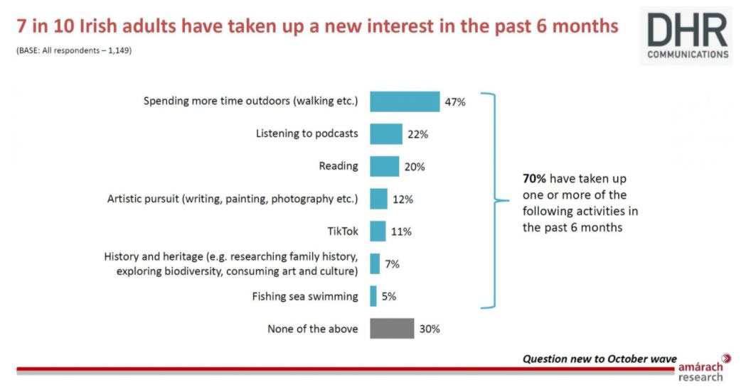 Among the nationally representative sample of 1,149 people, 47% have spent more time outdoors than before i.e walking, running etc.. According to DHR “with the availability of certain leisure activities – such as international travel and in-person socialising – greatly reduced, as well a much increased number of adults out of work, Irish people discovered a variety of new interests and activities with which to fill their time during the last six months”.