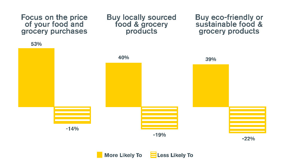 Our focus this week is on some of the motivations that will drive purchase behaviour in the next six months. The chart below gives topline findings for this week’s set of questions, with more than half agreeing that in the next six months they are more likely to focus on price than they have been. Four in ten respondents are more likely to buy locally sourced food and grocery products while a similar number will be more focused on eco-friendly and sustainable purchases in their supermarkets and convenience stores.