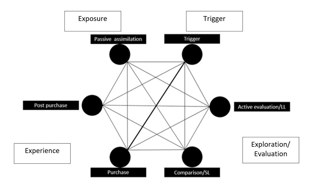 This interlinked model allows all points to be connected to all potential decision nodes. The benefit being there are no pre-formulated pathways or directions. As each node is linked to every other node this theoretically represents a vast number of potential paths to purchase.