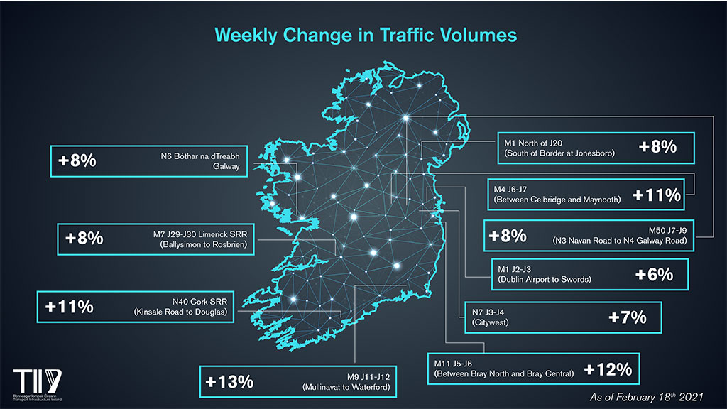 TII’s latest traffic trend information, covering the morning period from 7am until 10am and generated from a sample of ten traffic counters located on the national road network, reports an accelerating 9% weekly increase overall in volumes on Thursday 18th February.