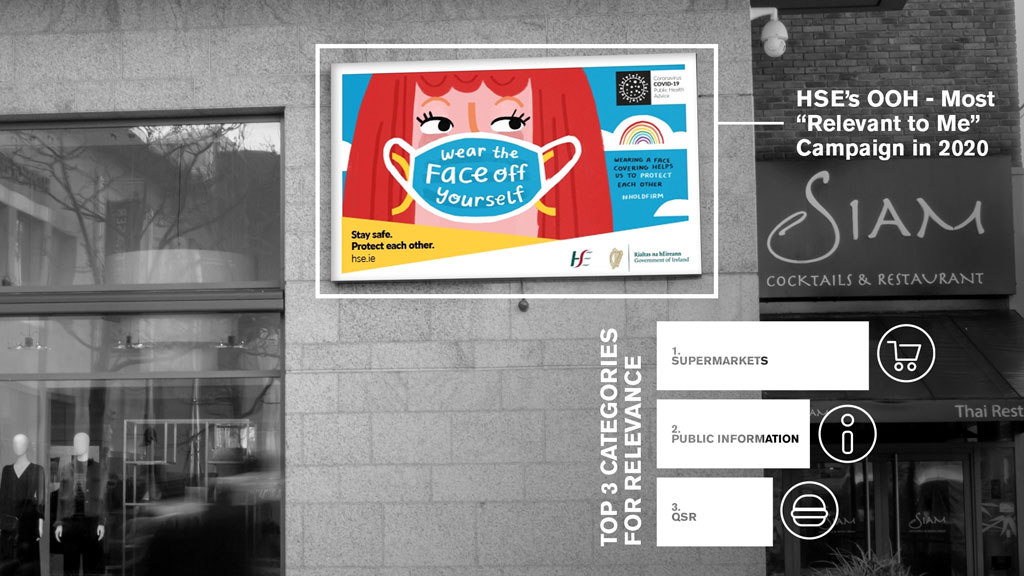 The HSE’s OOH work was considered the most ‘relevant to me’ campaign of 2020, with 90% feeling the campaign was relevant to some extent, with 66% agreeing strongly. The three best performing categories in terms of relevance were Supermarkets, Public Information and QSR.