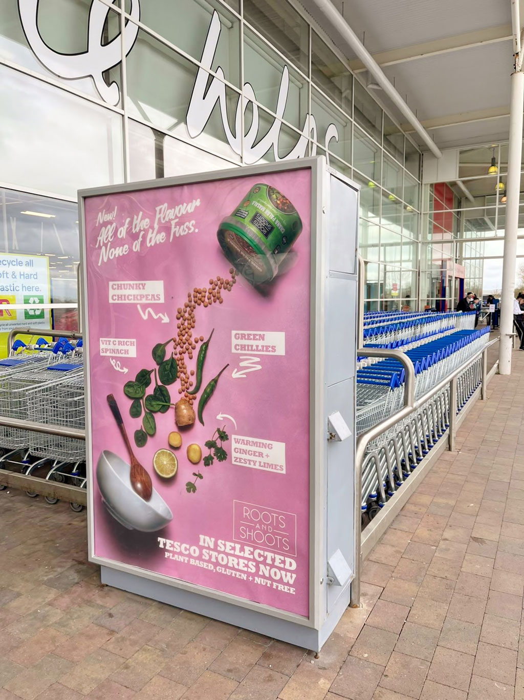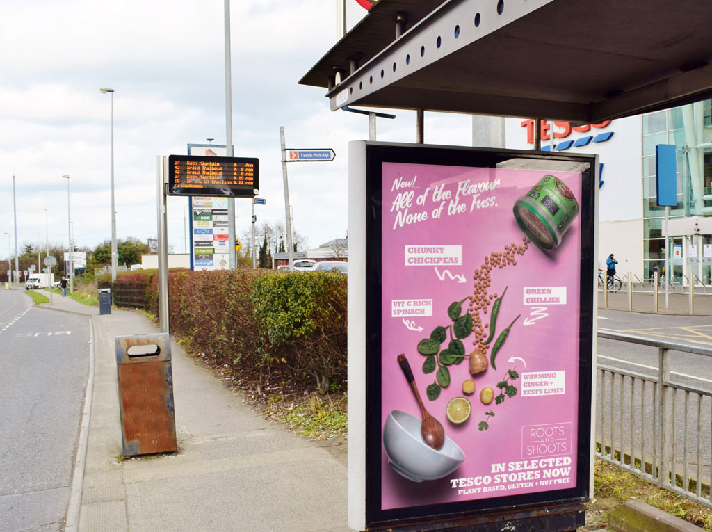 To introduce its new globally inspired vegan meal bowl range, Roots and Shoots is promoting its Chana Palak Masala across a range of 6 Sheets, planned by PML and targeting Tesco stores and includes bus shelters, Adboxes and Purchase Points.