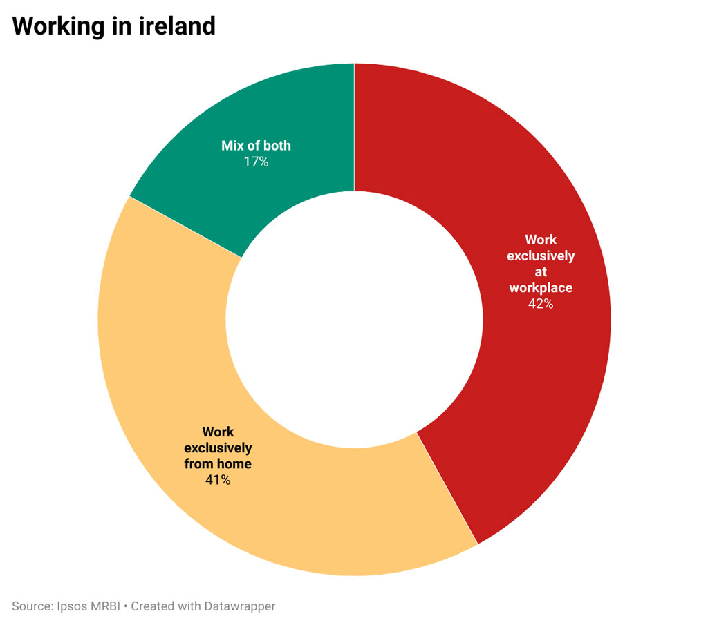 There is an even split in the numbers of Dubliners currently working at home versus the normal workplace. Just over 40% say they are working from home exclusively at the moment with an almost identical number claiming to be working only at their regular place of work. 17% are combing both. There is no major difference in age groups but most likely to be found working from home are the 25-34 year olds, at 45%. Least likely are 45-54s, at 35%. A greater percentage of males are working from home (42%, vs. 39% females).