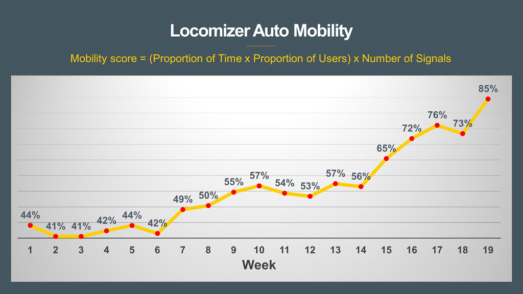 Last week’s national Locomizer mobility data, based on analysis of mobile phone location movements via anonymised app reporting, shows a relative +15% increase on previous week to 85% of pre-pandemic levels. This constitutes a doubling in mobility the past three months and a relative increase of +50% on the figure recorded only in mid-April.