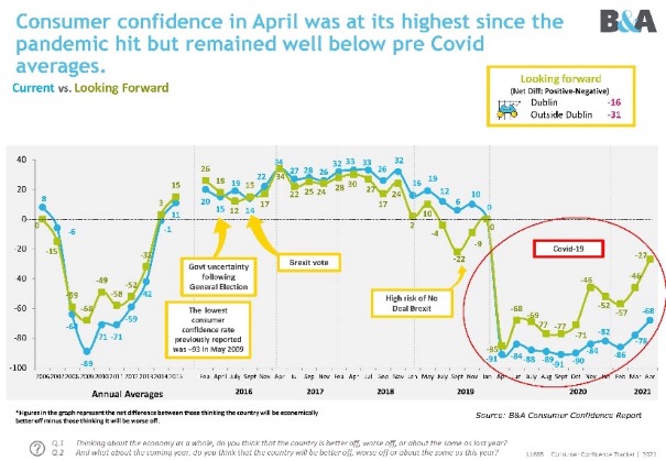 According to the latest B&A Consumer Confidence Barometer, consumer confidence in April was at its highest since the pandemic began with the easing of lockdown restrictions and the progression of the vaccine roll-out contributing to the uplift in confidence.