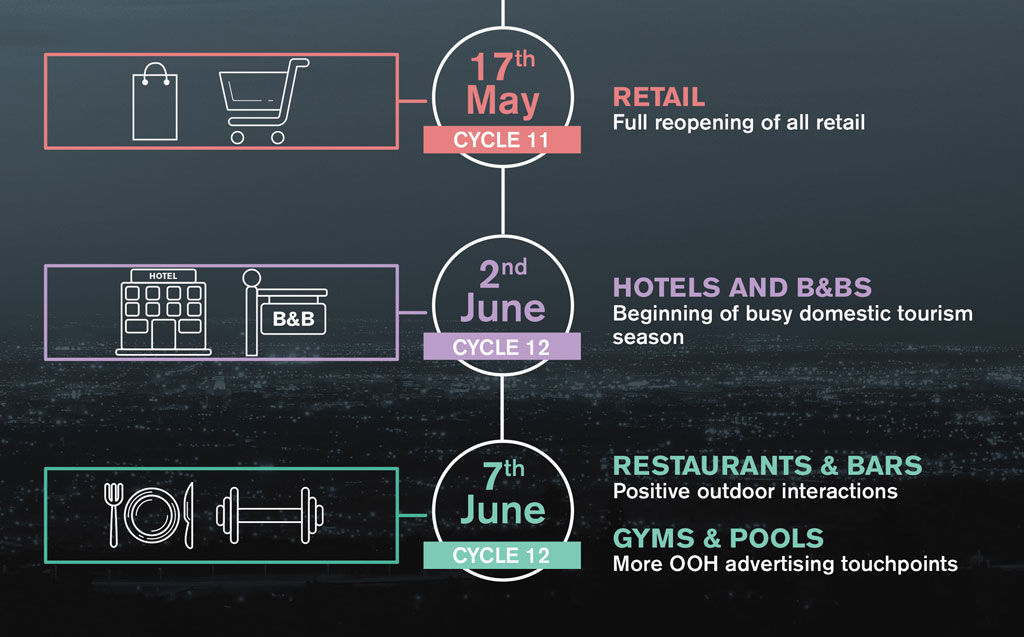 In two weeks’ time, we will see hotels and B&B’s swing open their doors with a big staycation boom expected as we head into the summer months and schools begin to wind down for the holidays. The following week on June 7th, the grand reopening of restaurants and bars will happen with outdoor dining infrastructure already in place to encourage and cater for customers returning to city centre hotspots, towns and villages – all contributing to more encounters with OOH advertising touchpoints.