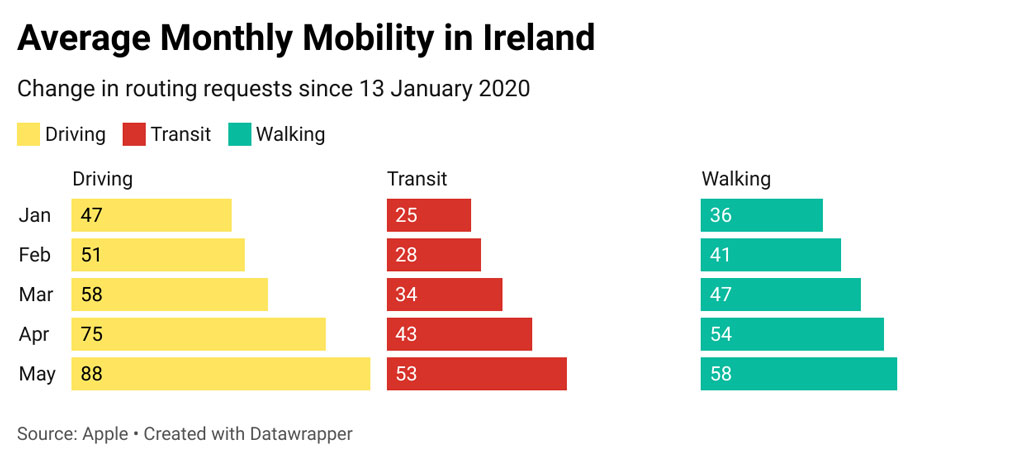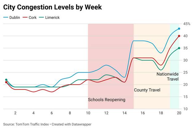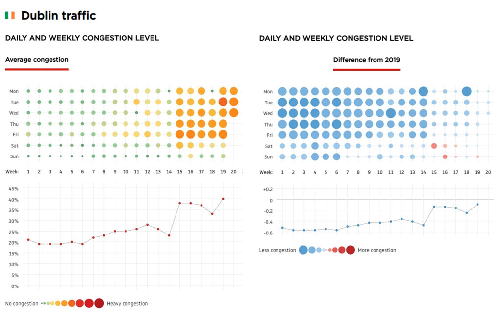 TomTom’s Traffic Index reports that last week’s congestion in Dublin reached yearly highs averaging 40%, up from 26% in March and 33% in April. To give historical context that is down just 9% on same week in 2019 while in week 19 last year the figure was just 16%.