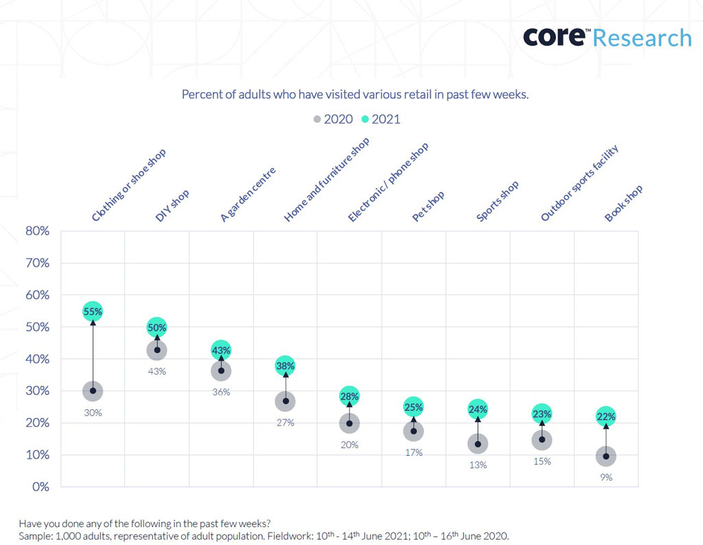 In its latest Consumer Mindset tracker Core Research has found that consumers are more confident in visiting retail stores, with clothing/shoe shops and DIY shops having experienced more than the majority of the population visiting them in the past few weeks.