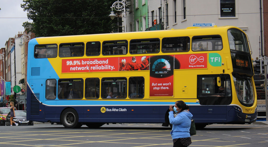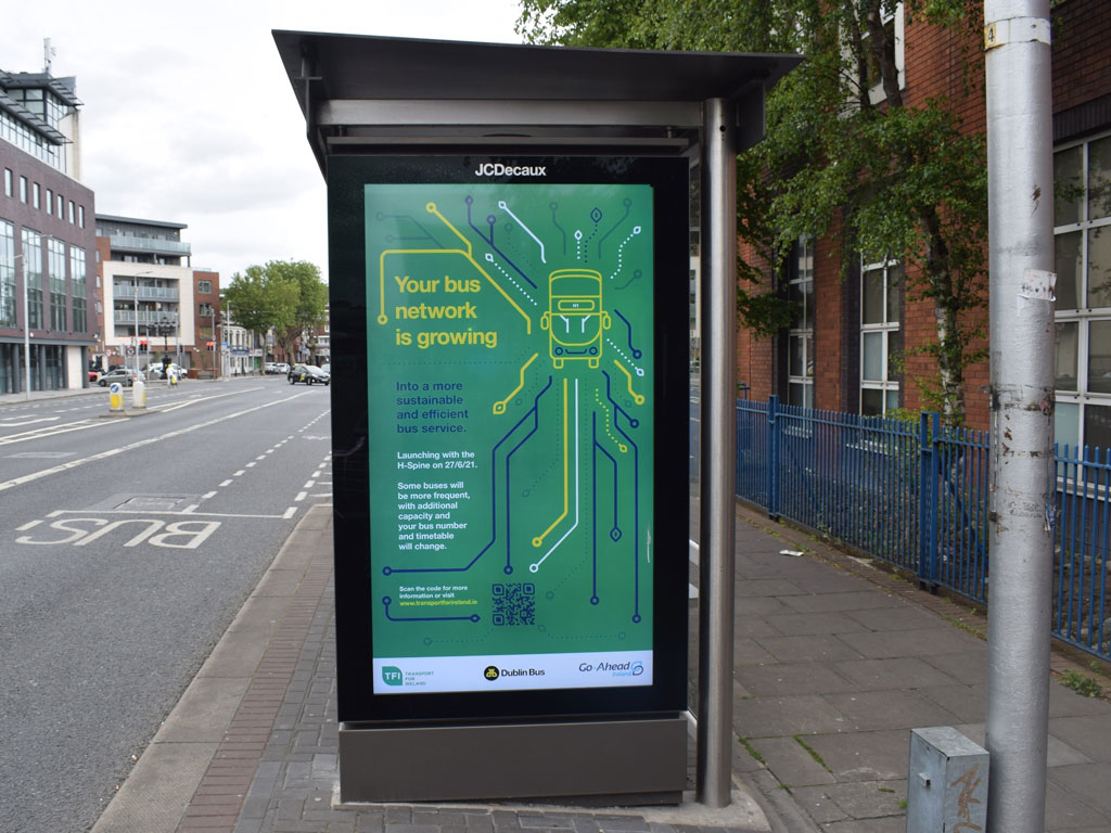 H is the first of eight ‘spines’ to be launched, which will connect with twelve orbital routes around the network. Next to begin will be C, running from Sandymount to Leixlip and Maynooth. The NTA estimates that Bus Connects will mean a 23% increase in services. The launch is being supported via an OOH bus shelter campaign.