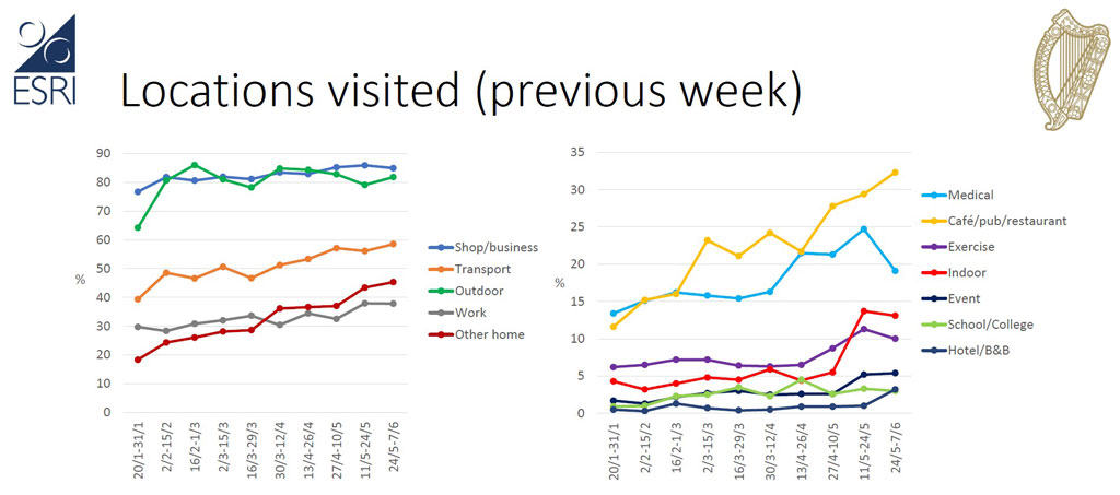 The latest report to June 7th, finds on average, adults in Ireland are visiting more locations outside their household on a weekly and daily basis. The largest increases in this latest round concerned visits to hospitality venues (cafés, restaurants, pubs, hotels) and other indoor locations, with a significant rise also in daily use of public transport.