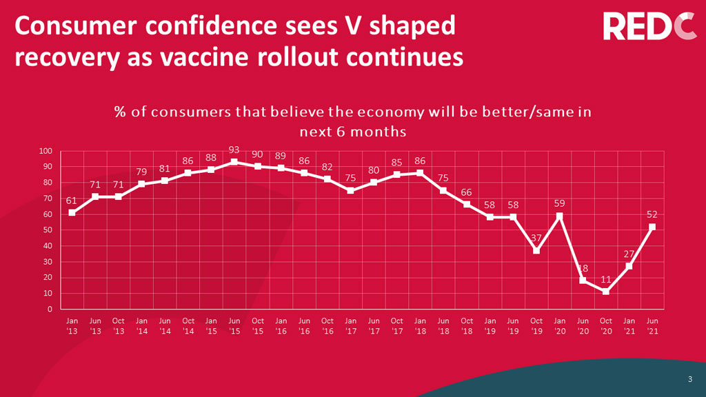 Elsewhere the latest RED C Mood Monitor reports that consumer confidence has continued to rebound with the ongoing rollout of the Covid-19 vaccination programme, and the gradual easing of restrictions. The June edition records a significant upsurge in consumer confidence in the Irish economy, rebounding from a low point in late 2020, the lowest level recorded since the global financial crash.
