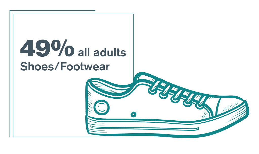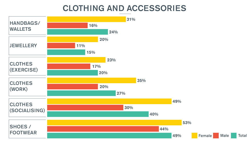The genders are a bit more aligned when it comes to shoes and footwear. 49% of all respondents will be making an investment in this category soon. This equates to 44% of males and 53% of females. That hits 60% among younger females.