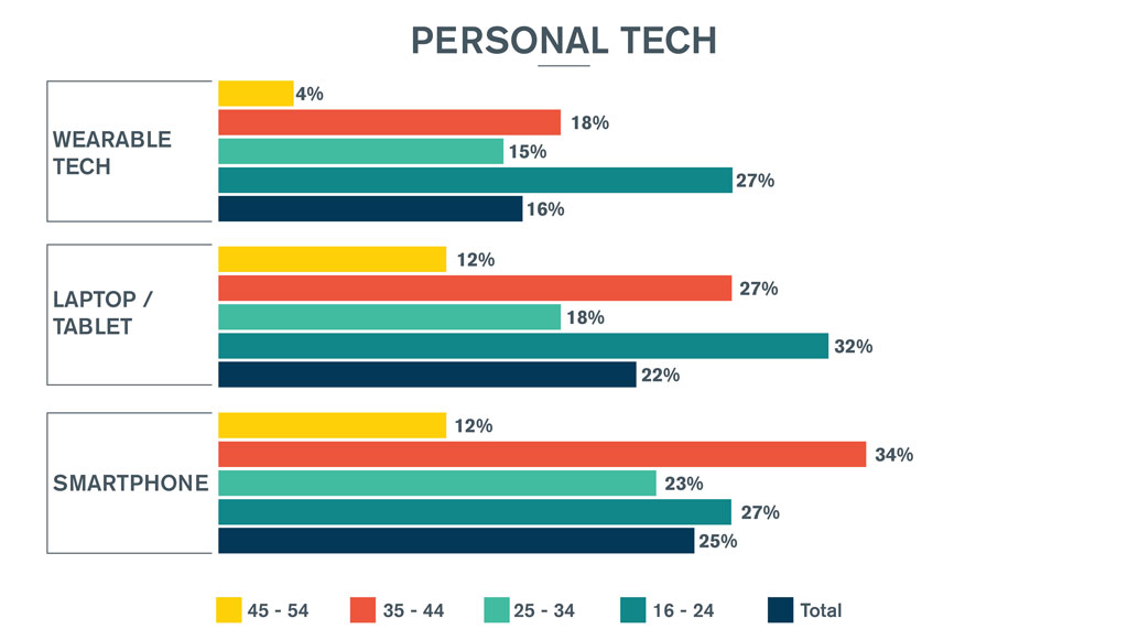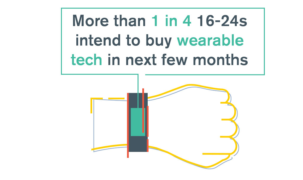 More than a quarter of 16-24s (27%) intend on purchasing wearable smart devices such as a watch or Fitbit. These devices are more of a priority for females in this age group than smartphones are, 23% v 30%.