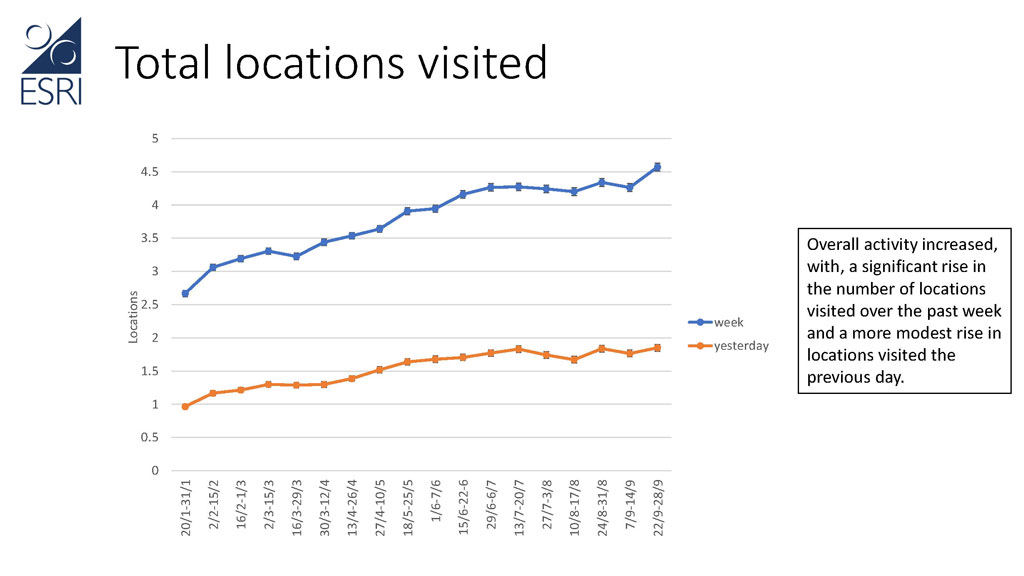 The number of locations visited during the previous day and over the past week (especially) went up, resulting in a further increase in overall social activity following a drop-off during the summer holiday period.