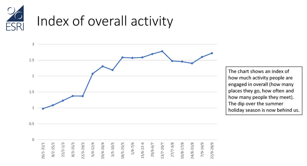 The latest report presents results from a nationally representative sample of 1,000 adults who participated in the study between September 22nd and 27th – the eighteenth wave of the survey. Data collection took place shortly after the beginning of a staggered return to work starting on September 20th. Restrictions on outdoor group activities and some organised indoor events were also lifted.