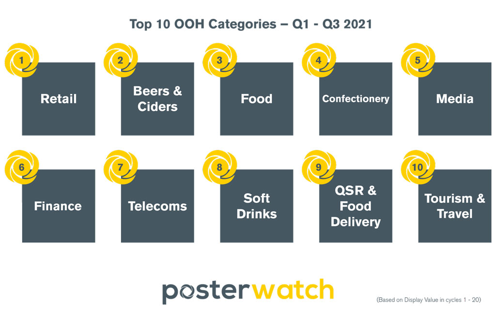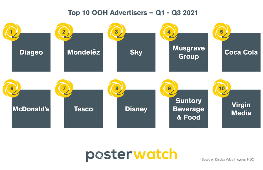 In terms of top advertisers, Diageo and Mondeléz lead the way, with large brand portfolios meaning both are active much of the time. Support for zero alcohol variants of Guinness and Carlsberg are among the highlights for Diageo so far, along with Outdoor backing for the extension of the Rockshore brand. Disney are firmly established in the top 10 in 2021, despite the streaming platform launching only eighteen months ago in Ireland. The brand has embraced OOH and DOOH’s flexibility and agility. Sky and Virgin Media, other prominent media brands, are also among the top 10. Long-time OOH advocates, McDonald’s and Coca Cola feature strongly again.