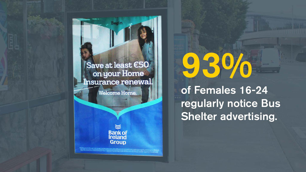 In partnership with Ipsos MRBI, our insights team at PML Group surveyed 300 Dubliners, aged 16-54, in December 2021. A large majority of respondents – 72% – agreed that they regularly noticed advertising on bus shelters. A major attraction for brands on OOH is the connection to a young, mobile audience and that is reflected in the 88% agreement levels among 16–24-year-olds in respect to noticing bus shelter advertising. For females in this age group, the agreement levels hit a staggering 93%. Bus shelters would also be among the best performing formats in our ongoing Impact research programme, which measures the recall of individual OOH campaigns by format.