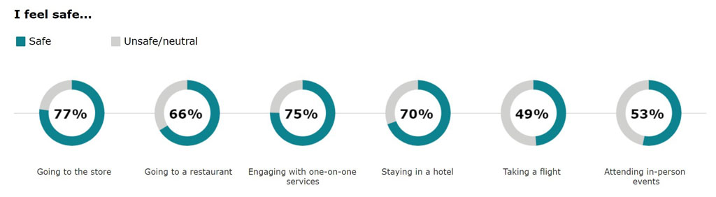 Nearly 4 in 5 Irish adults now feel safe visiting a store, up from 62% in December while three quarters of us are comfortable engaging in person-to-person services, up from 60% at the end of last year. Two thirds of respondents now feel safe visiting a restaurant.