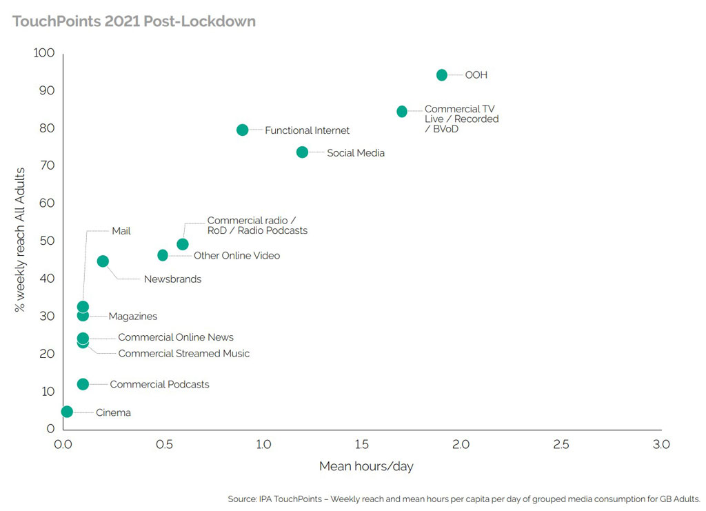 In its new TouchPoints report Making Sense reports the IPA (Institute of Practitioners in Advertising UK) this week reported that “Increasingly media planners are facing challenges when building broad-audience, high-reach campaigns, and with the exception of OOH, no single curated channel can reach 90%+ of All Adults per week…OOH is once again leading in terms of overall reach and time spent.”