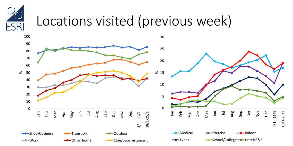 Wave 26 of the ESRI’s Social Activity Measure – which is based on data collected during the week to January 25th, reported a large increase in social activity, especially following the 21st January announcement. People visited more locations outside the home, during both the previous week and the previous day. Visits over the week increased for all locations. Significant increases were seen in visits to shops/ businesses, work, café/pubs/restaurants, exercise, event, and hotels/B&Bs. There was also a sharp recovery in intercounty travel.